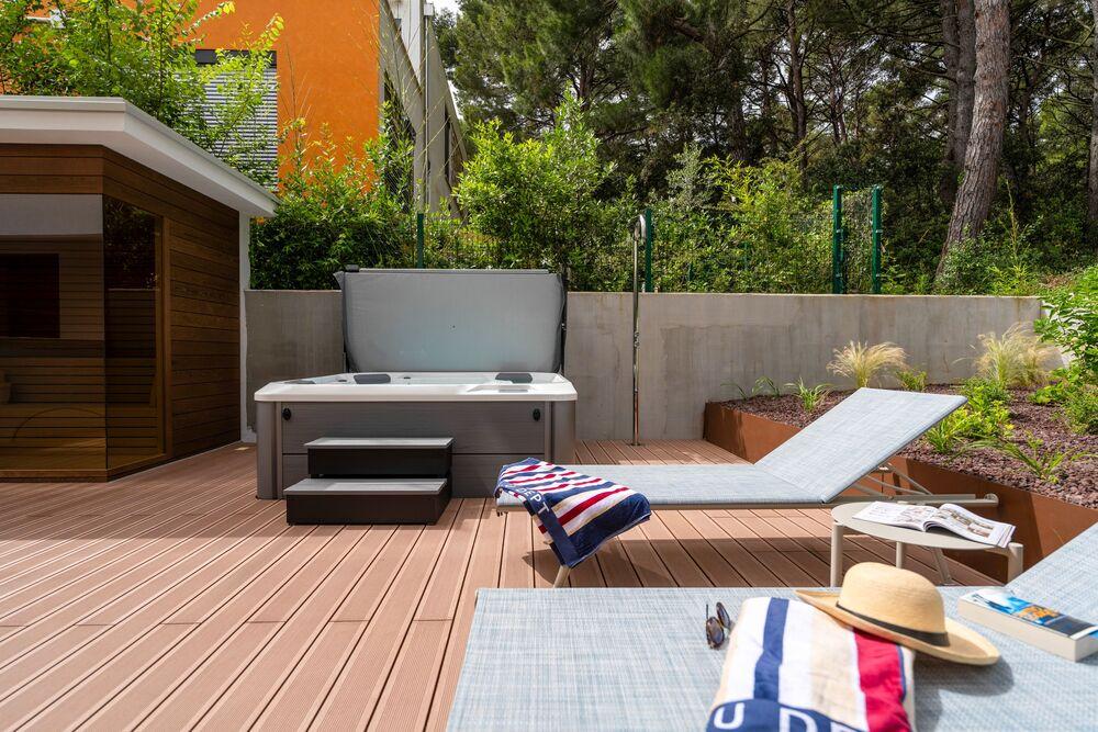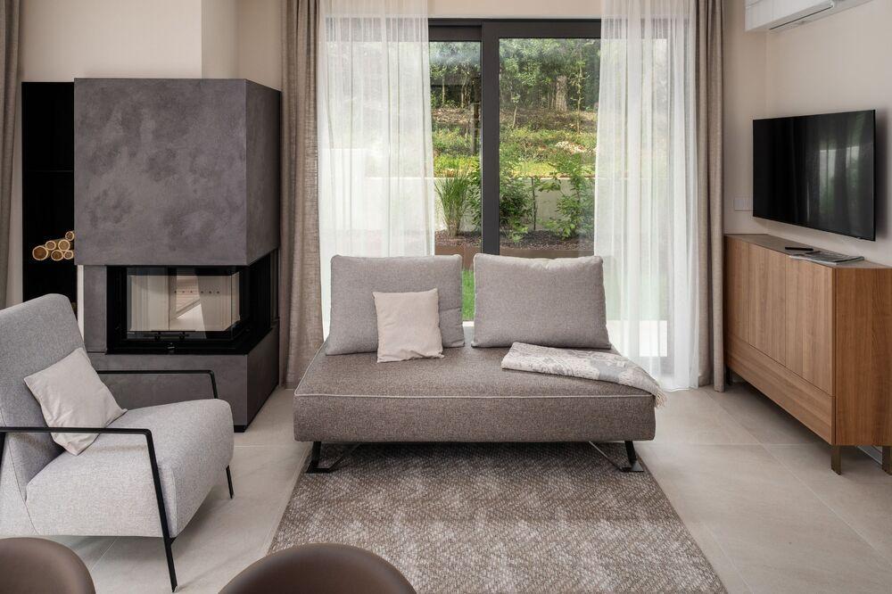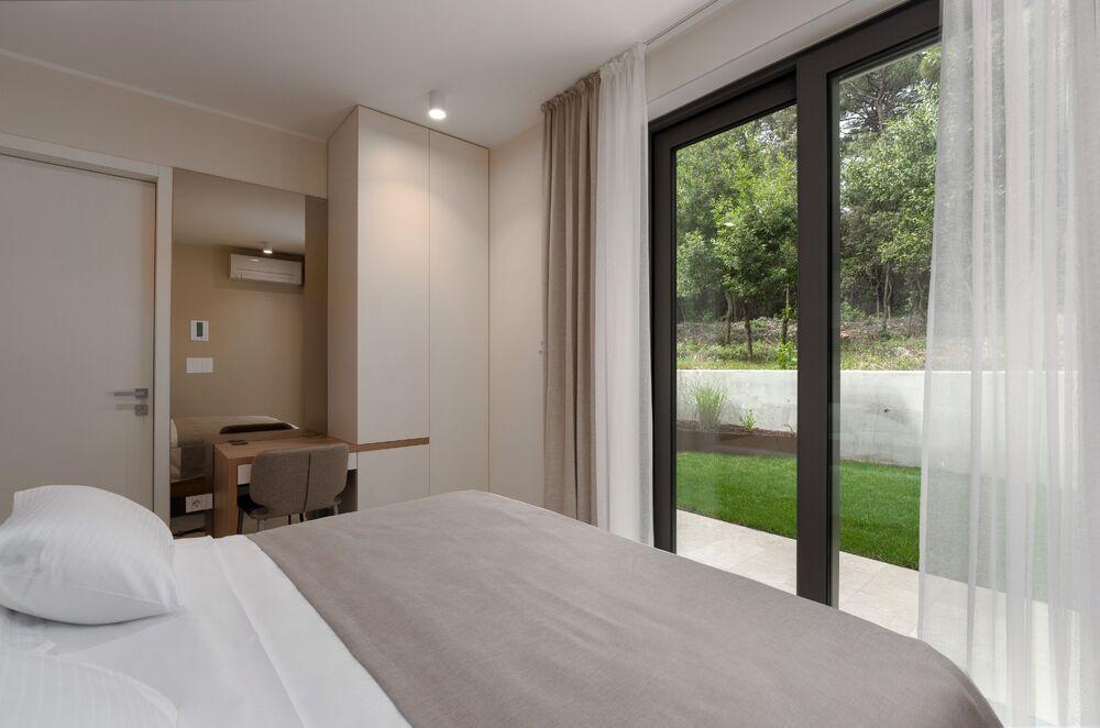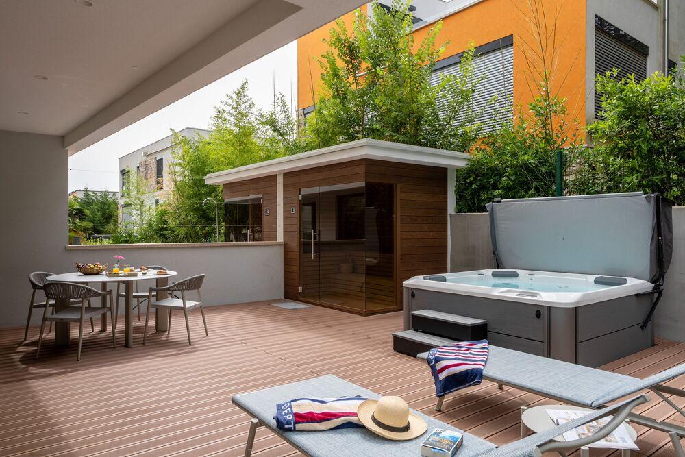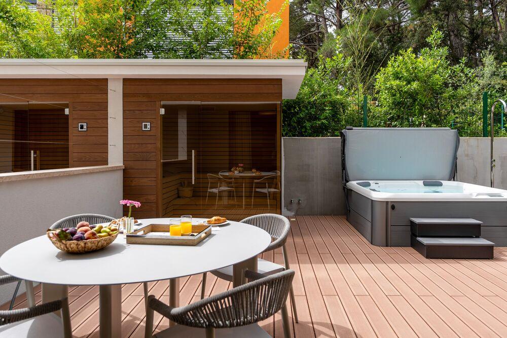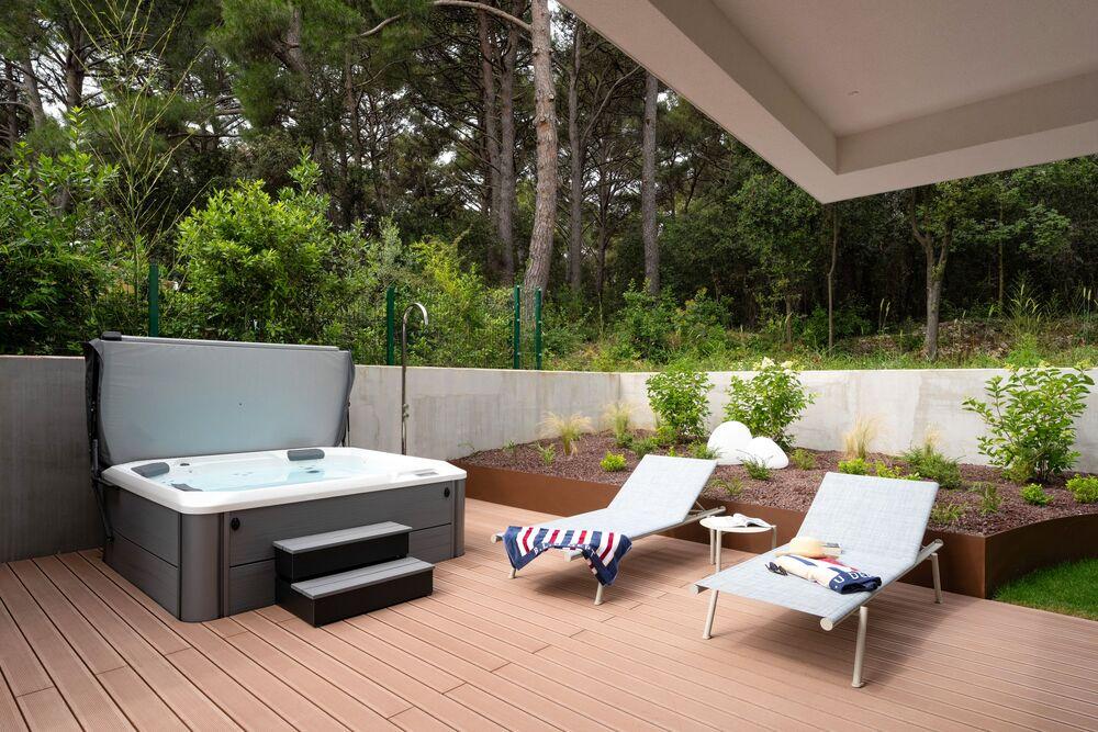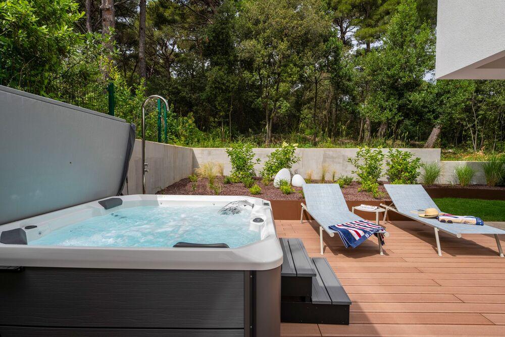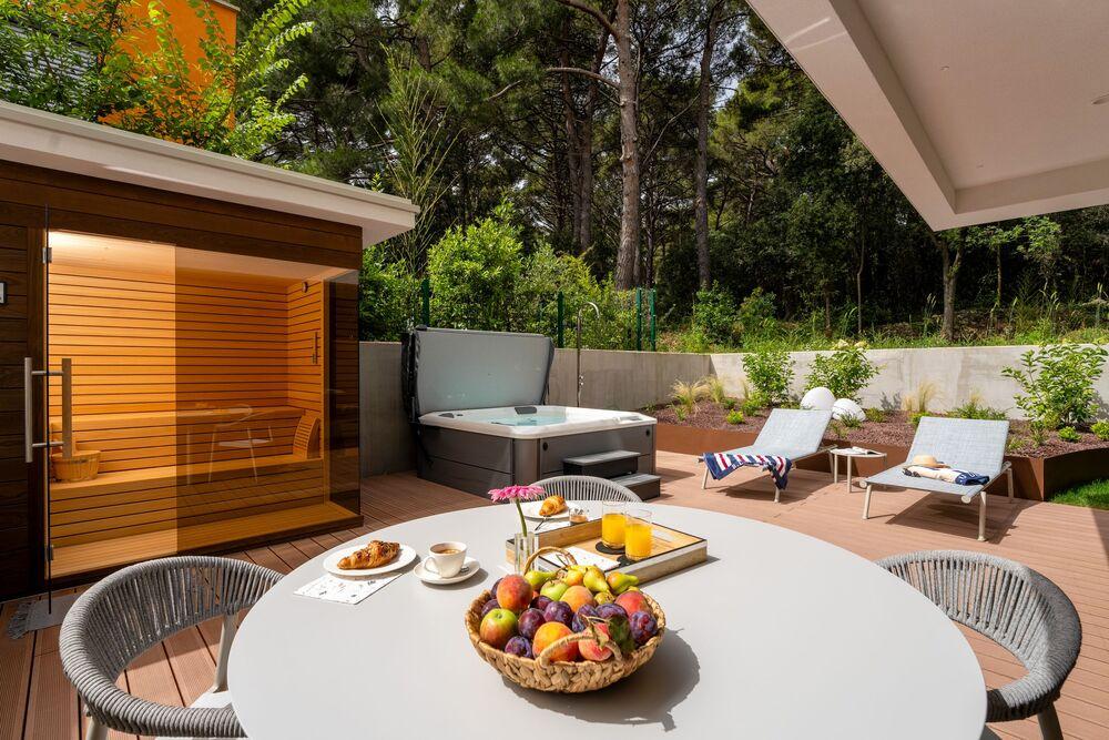 It is located on the ground floor and has an area of 105 m2. It consists of two charmingly decorated bedrooms, two bathrooms, a fully equipped kitchen with a spacious living room and a utility room. The large terrace and garden offer additional space for relaxation and socializing, with an outdoor sauna, hot tub, shower and comfortable sun loungers. Next to the terrace is a beautifully landscaped elevated garden with ambiental lighting, and the nearby forest of magnificent tall pines and oaks provides shade and the relaxing sounds of birds and crickets.